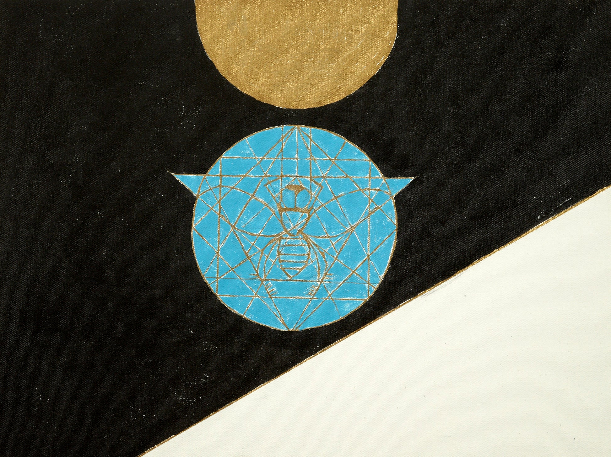 The artwork centers on a light blue circle, intricately detailed with fine gold geometric lines that form a pattern suggestive of a drone bee. This symbolic emblem is placed against a split background, with black covering the upper and left areas and white filling the lower right. Above the blue circle, a strong, solid gold semi-circle contrasts sharply against the dark backdrop. The composition intertwines abstract and symbolic motifs, highlighting geometric forms and vivid contrasts to evoke a profound, mystical significance.