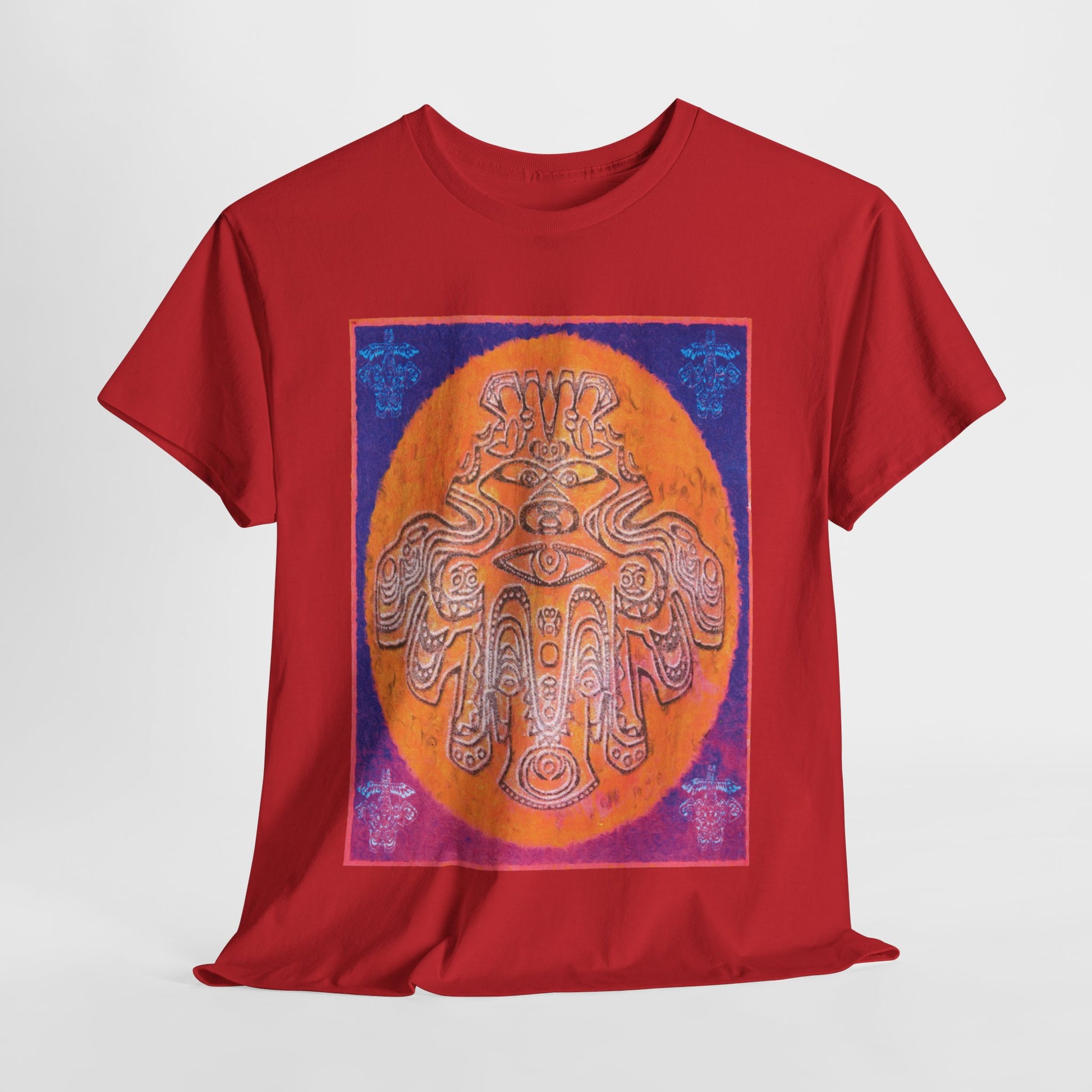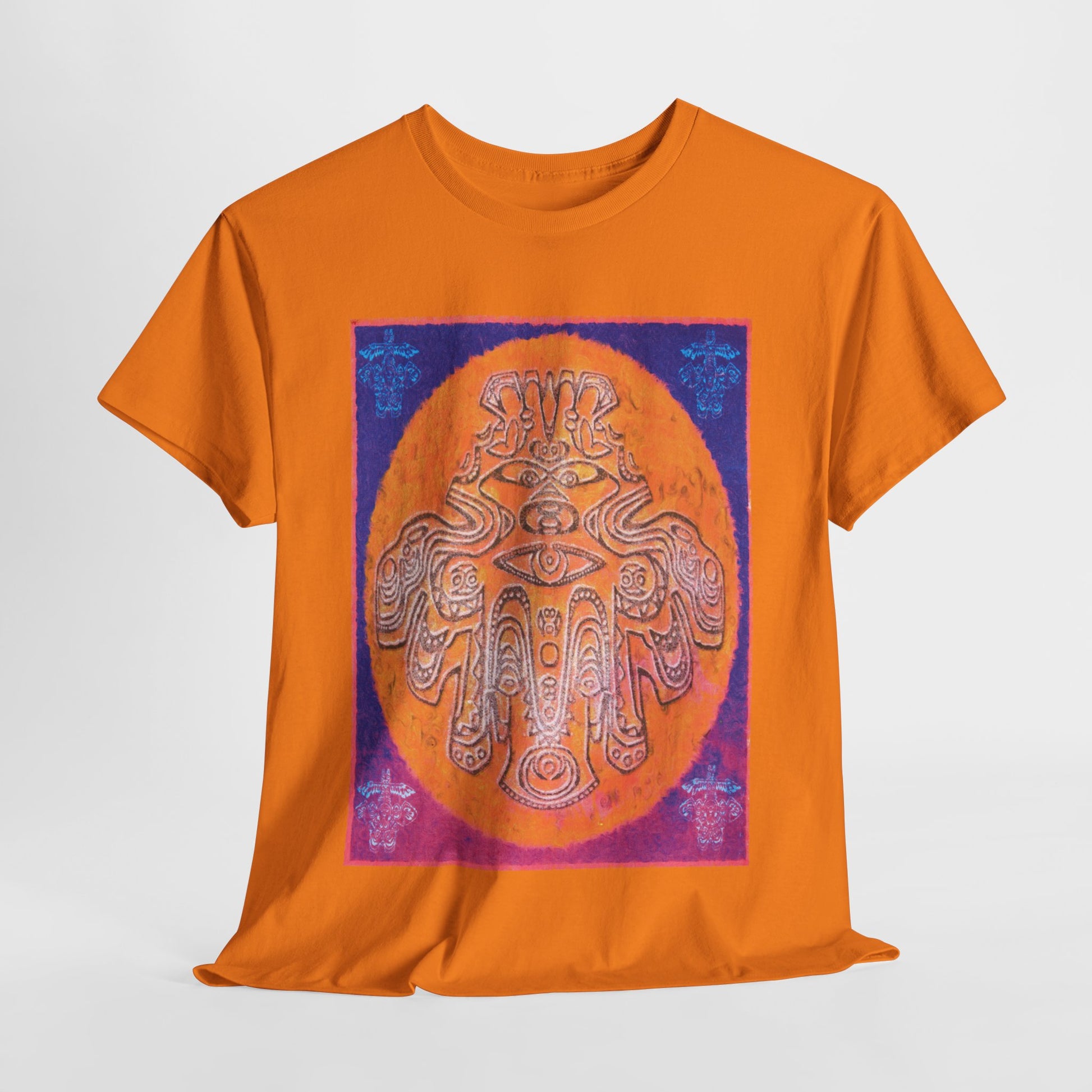Inspired by ancient spiritual art, this apparel features a vibrant, intricate depiction of a Pre-Columbian or Indigenous-style deity/spirit figure. The design centers a powerful, anthropomorphic entity with symbolic eyes and elaborate patterns, set against a striking orange sun-like circle. Rich colors like deep purple, radiant orange, and vibrant blues and pinks evoke cosmic energy and ancient wisdom, making it a unique statement piece connecting to history, spirituality, and bold artistic expression.