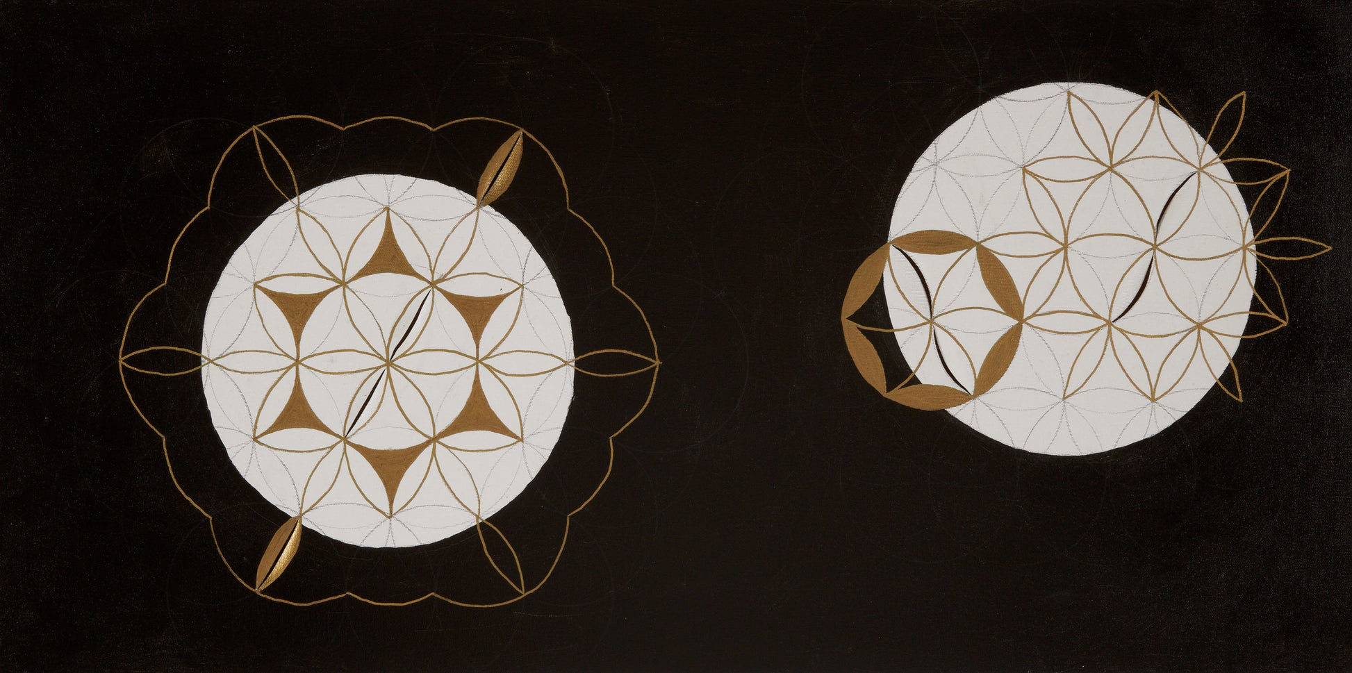This artwork features two large white circles set against a black background, each filled with intricate, overlapping geometric patterns inspired by the Flower of Life. Rendered in gold and white, the design highlights symmetry, balance, and sacred geometry, with almond-shaped motifs selectively filled in golden brown. The left circle is encircled by a wavy, petal-like outline, while the right includes overlapping floral elements, creating a layered, dimensional effect. The use of contrast and precise patterning evokes themes of harmony, interconnectedness, and metaphysical symbolism.