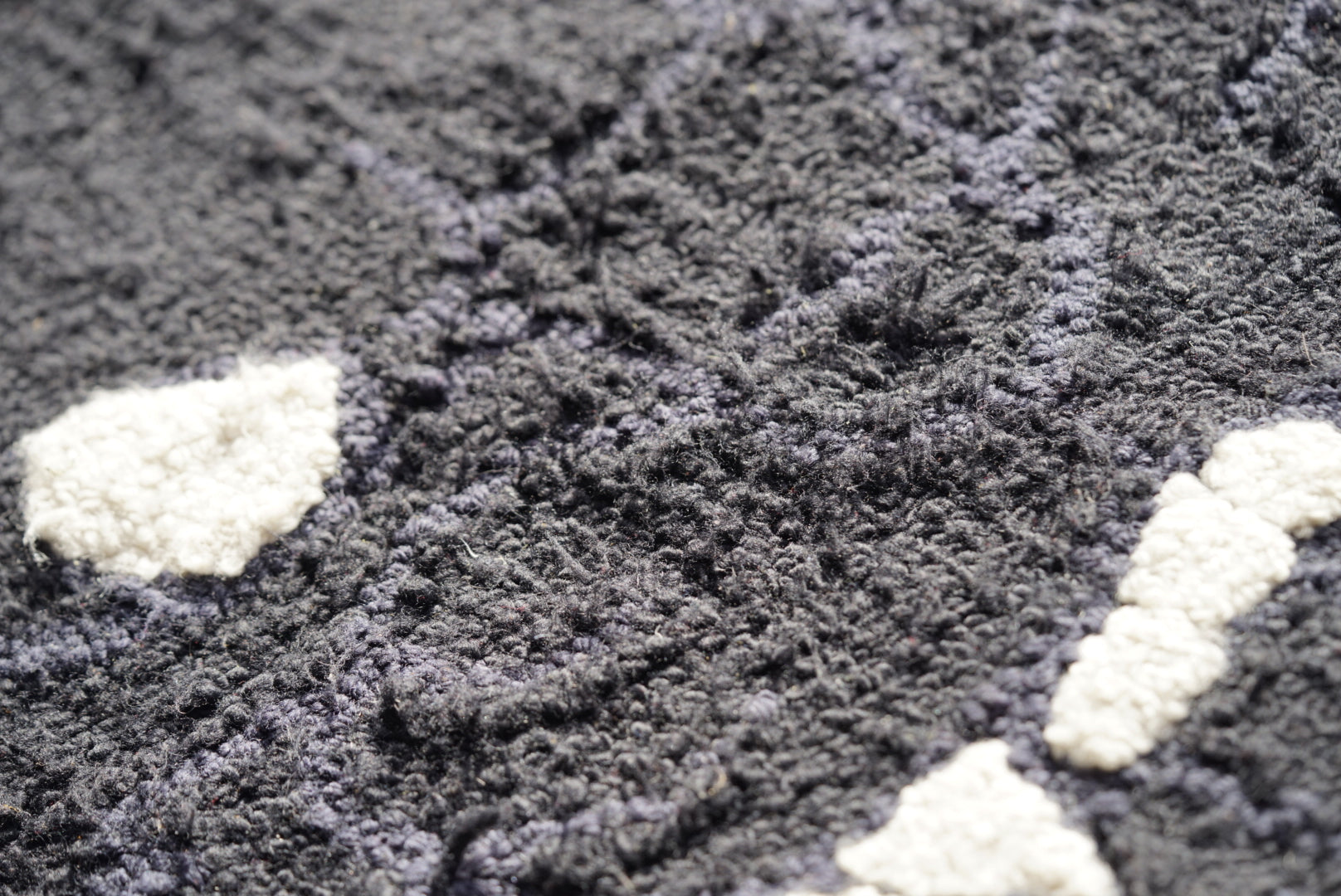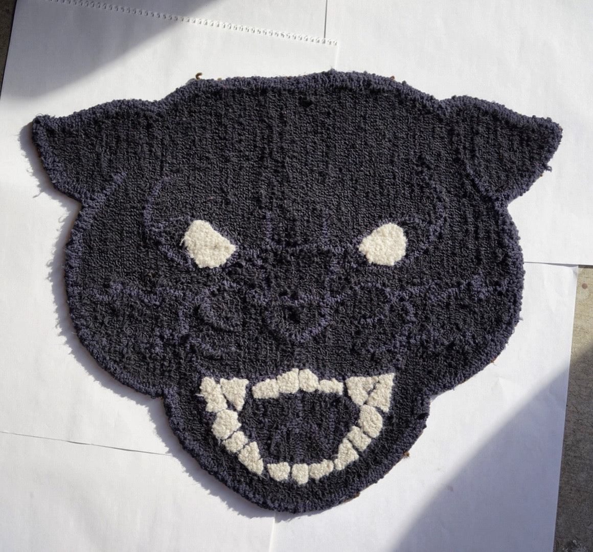 This handcrafted rug features the fierce face of a black spotted leopard, stylized in a bold and minimal palette. Woven in deep charcoal black with cream-white highlights for the eyes and bared teeth, the rug captures an expressive, almost cartoonishly intense snarl. The texture is dense and looped, giving the face depth and dimension while maintaining a soft, tactile finish—perfect as a statement wall piece or wild floor accent.