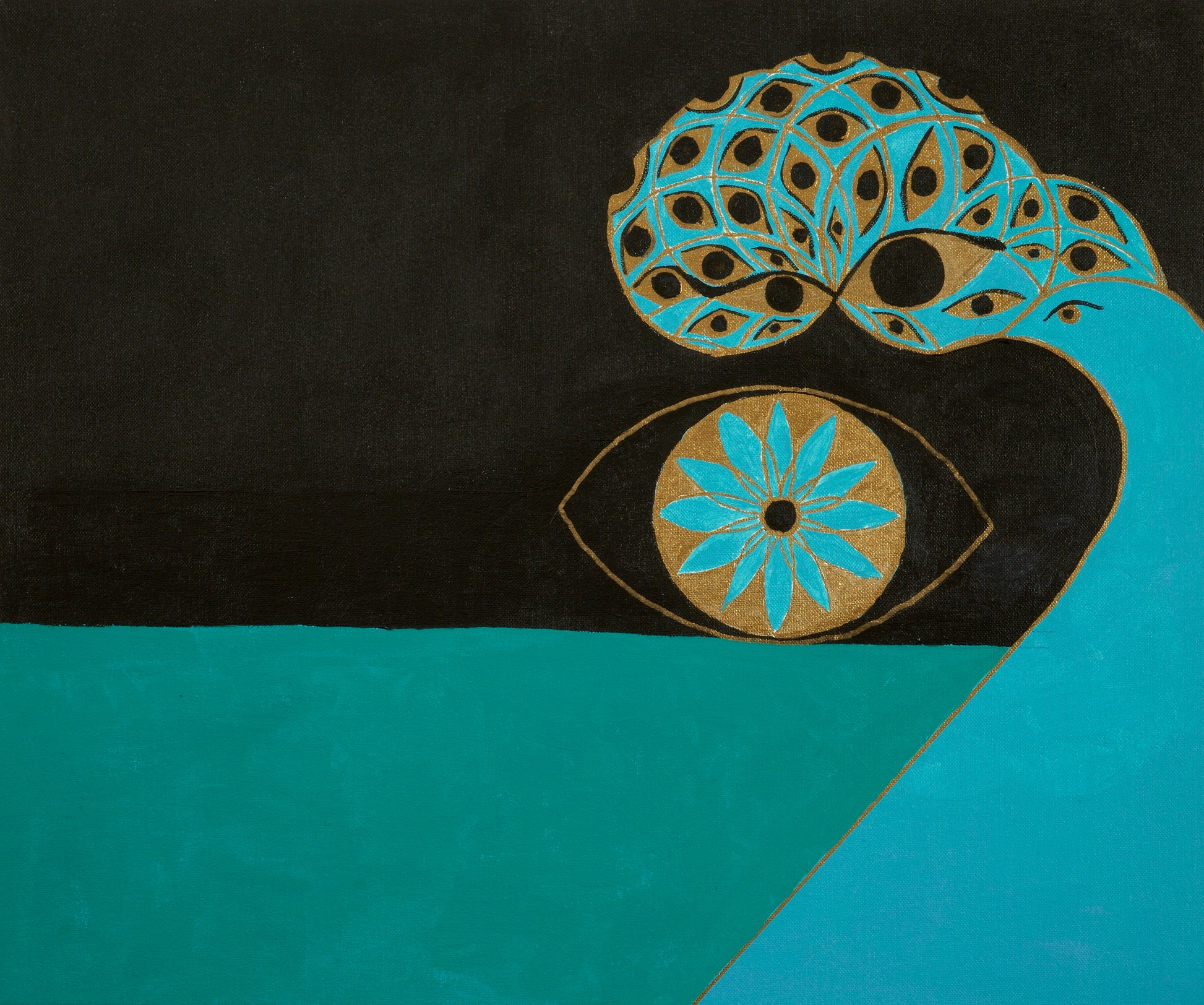 A distinctive, stylized eye commands the lower center, reflecting ocular themes and evoking a deep link to inner perception and universal awareness. The rich dark background enhances the striking teal and gold details, producing a compelling visual effect that is simultaneously mystical and contemporary. This piece is perfect for discerning collectors who appreciate the fusion of spiritual symbolism with a refined, modern design.
