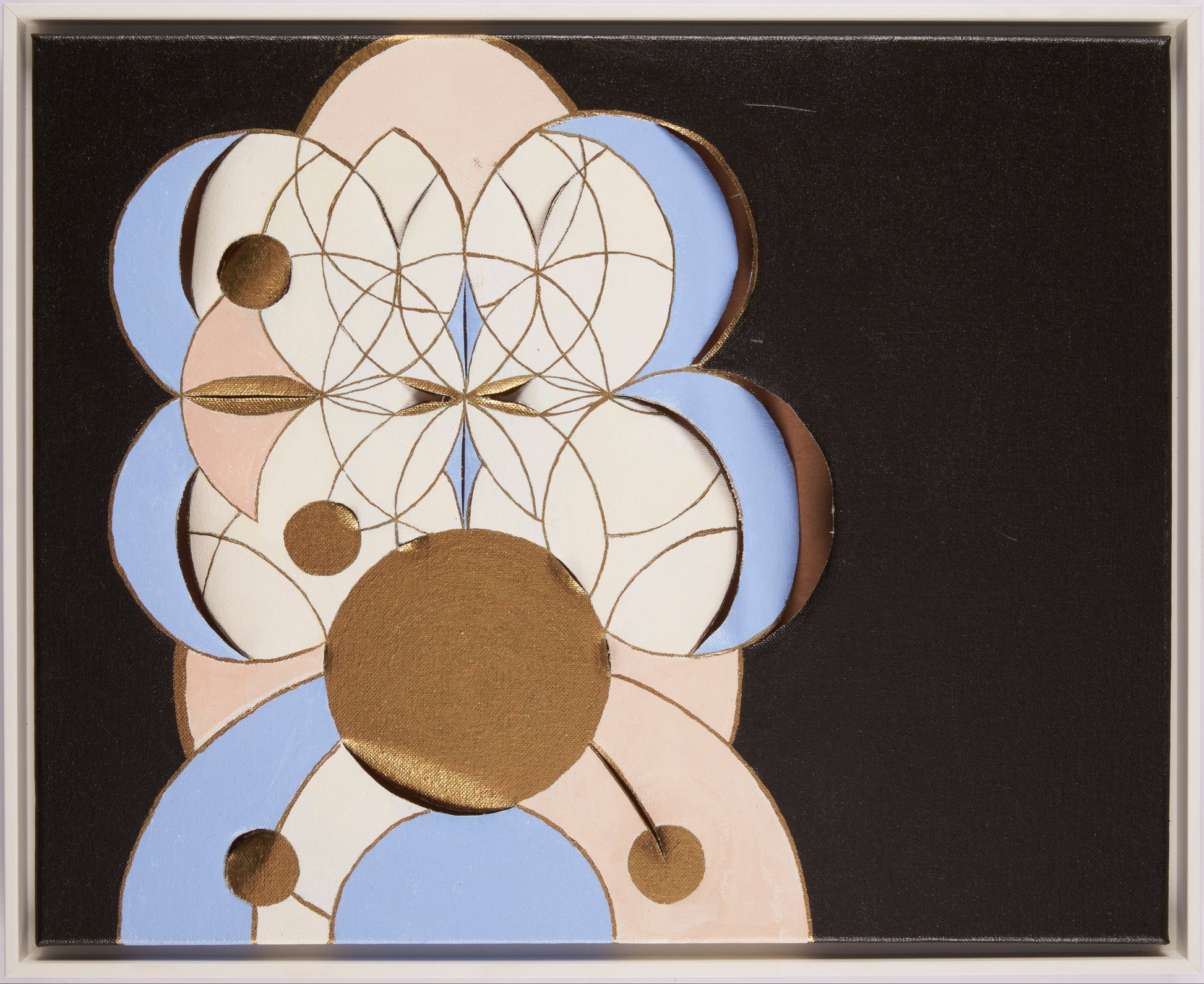 This painting, seen as a primordial trophy, may symbolize an artifact from an ancient, possibly cosmic, civilization. Its geometric designs, echoing sacred geometry and celestial forms, hint at deep, elemental wisdom. The blend of gentle pastels—pink and blue—with bright white and glowing gold set against a rich black background creates an aura of fragile creation intertwined with lasting strength. The golden circles and lines, with an almost embossed effect, suggest precious elements or cosmic alignments, marking it as a relic of profound spiritual significance from the dawn of existence.