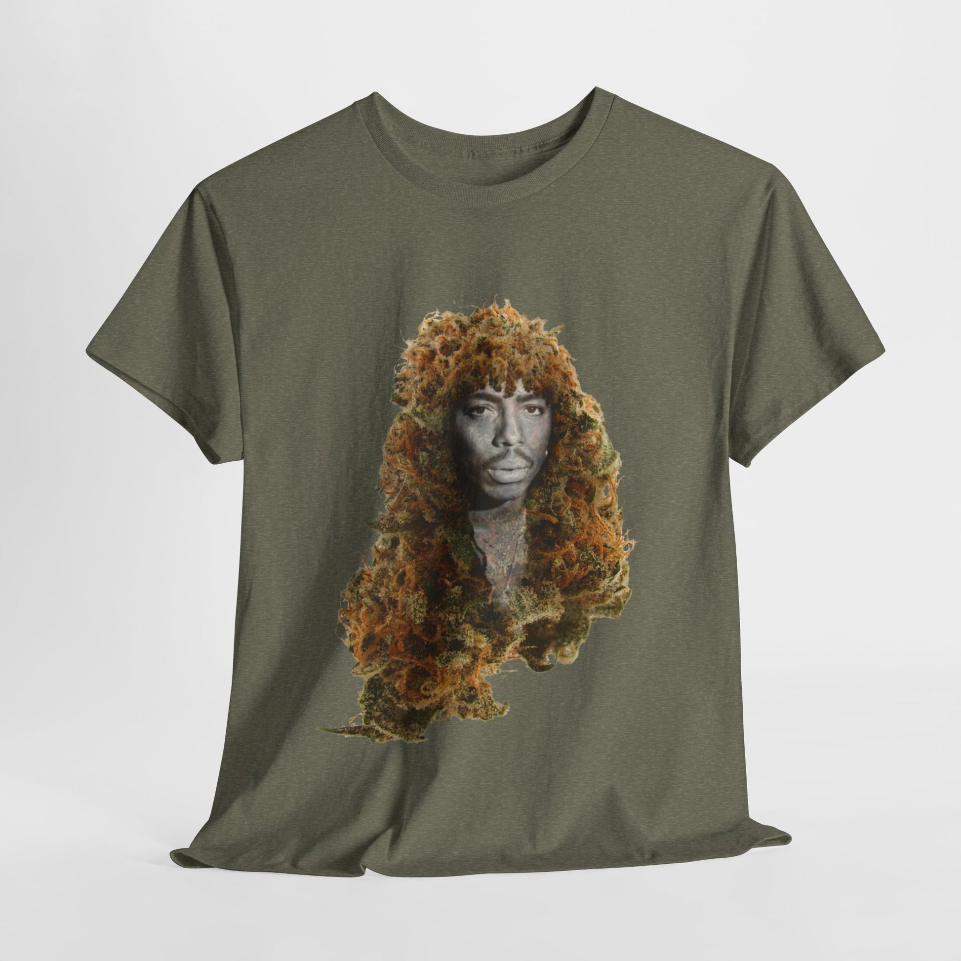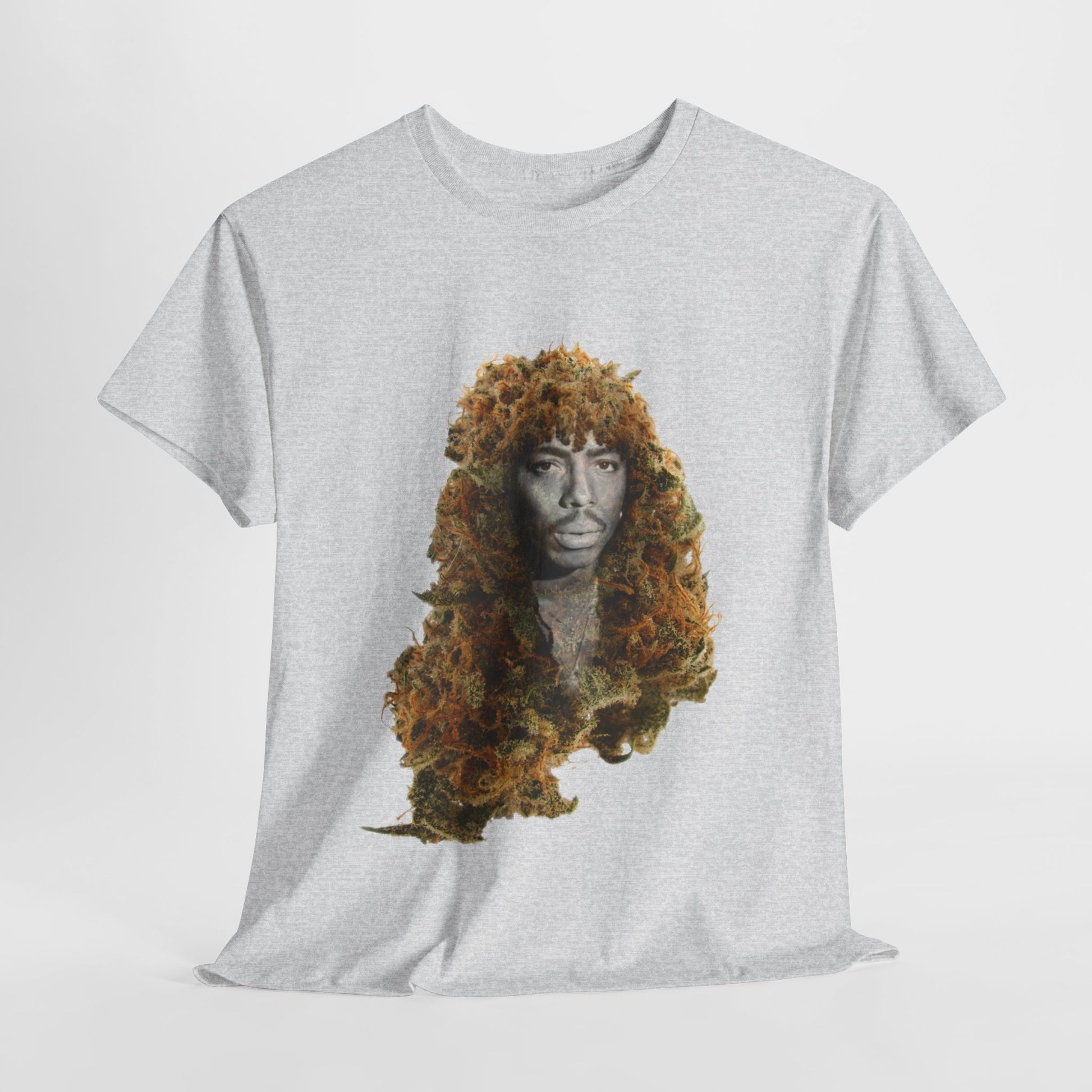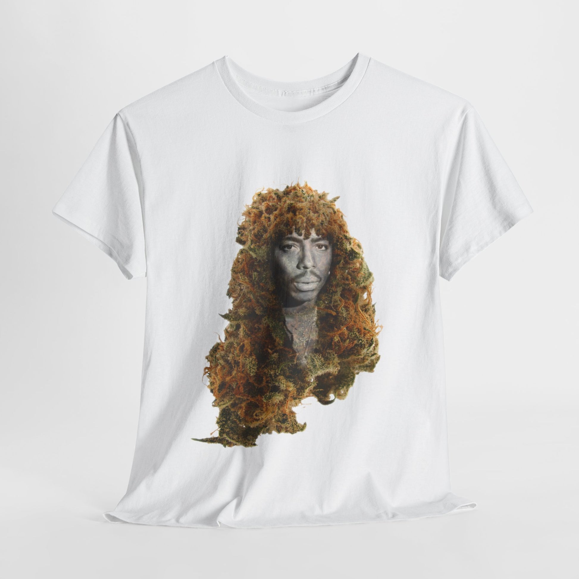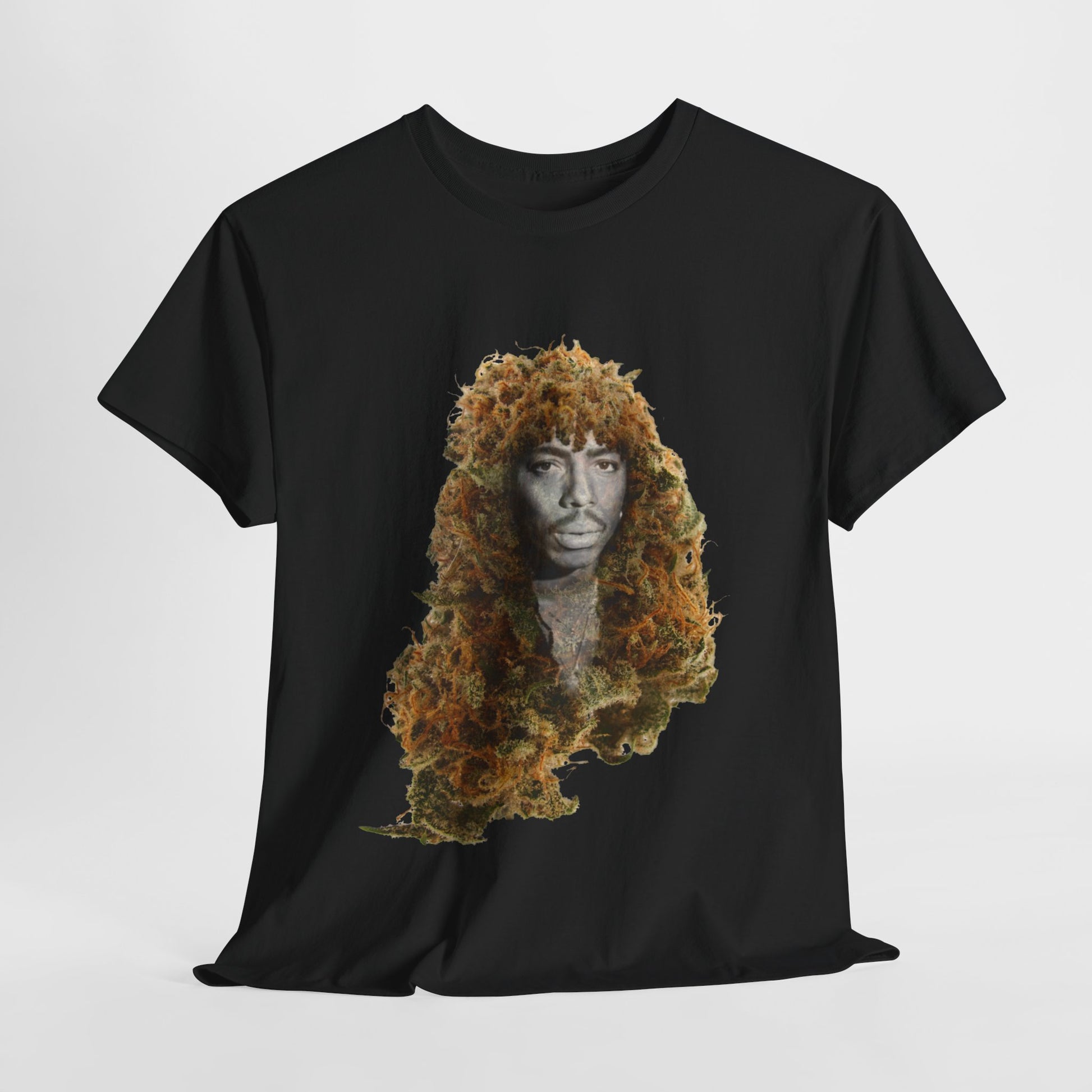 The black and white image reveals a figure crowned with a Jheri curl crafted from cannabis, unmistakably embodying the spirit of the late Rick James. This legendary American artist, famed for his dazzling persona and iconic tracks such as "Super Freak," continues to enchant through his enduring musical legacy.
