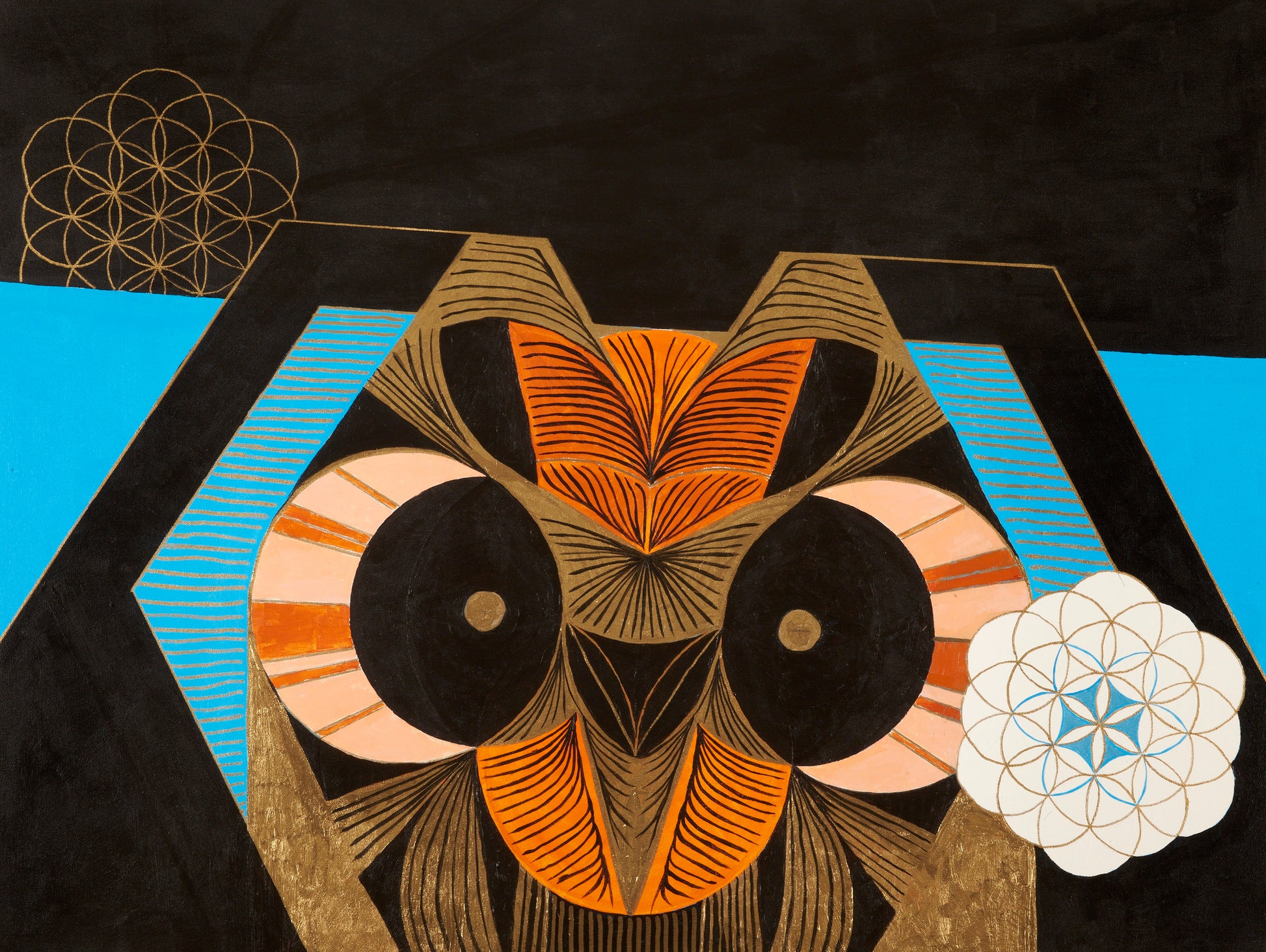 Suspiro de Geometria features a striking, stylized eye centered at the lower portion, reflecting themes of inner vision and universal consciousness. Set against a deep dark background, the vivid teal and gold accents create a captivating contrast that blends mysticism with modern design. This piece is perfect for collectors who appreciate artwork that merges spiritual symbolism with a bold, contemporary style.