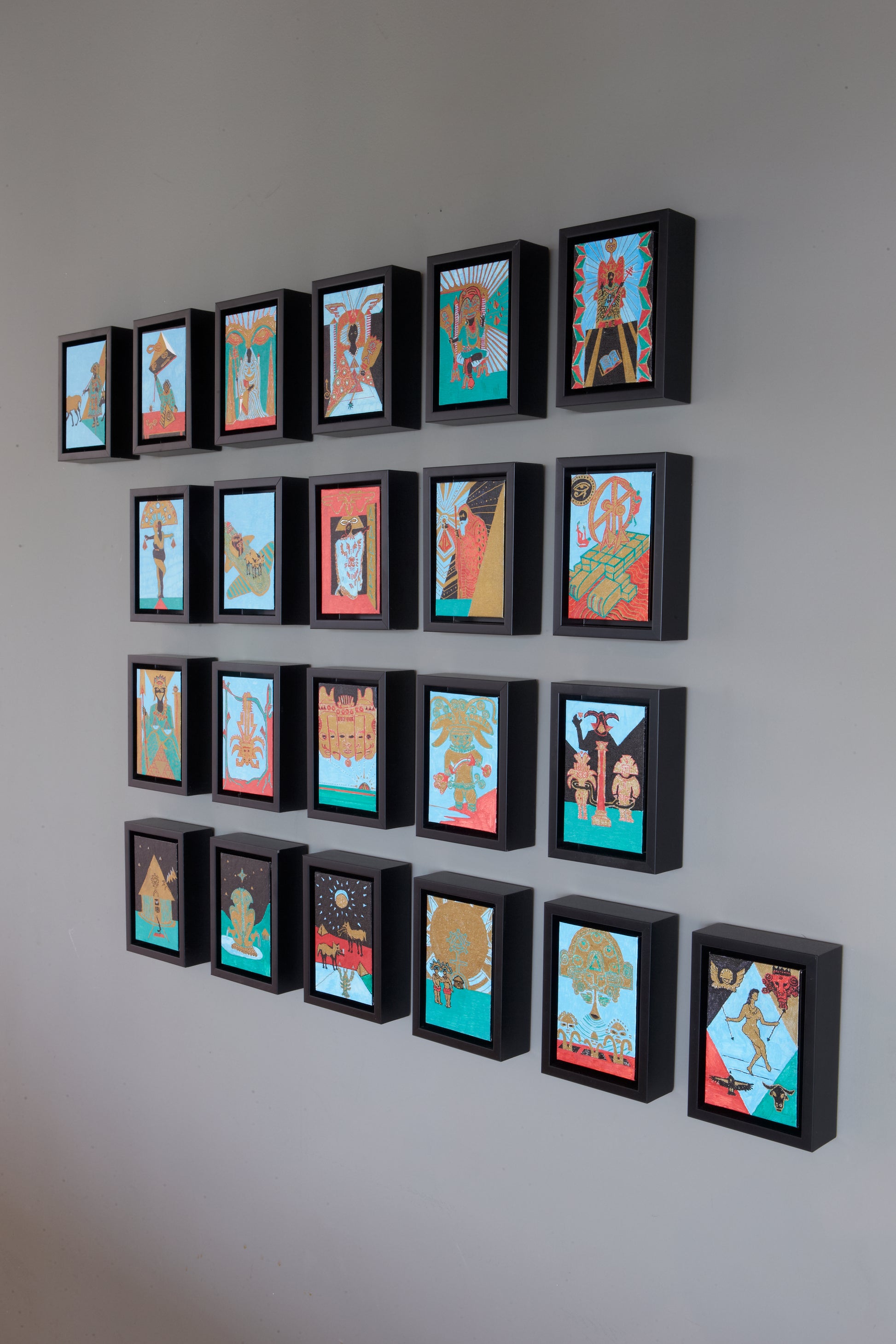 This collection offers 22 unique oil paintings on board, with each artwork measuring 3" x 4" x 2". These paintings draw inspiration from the combination of the Marseille and Rider Waite decks, while incorporating Colombian mythological symbols to present a fresh perspective on traditional South American tarot decks.
